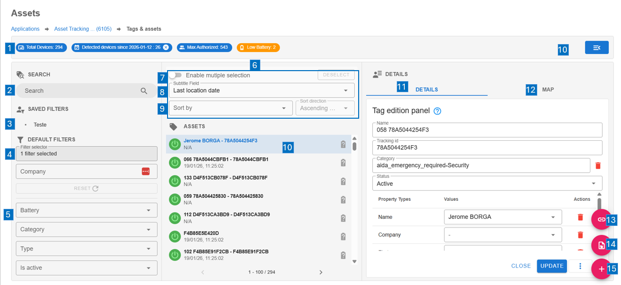 The Tags & Assets page lets you view and manage all trackable devices in your application. You can filter, search, edit, and perform bulk operations on your tags, smartphones, and metadata devices.